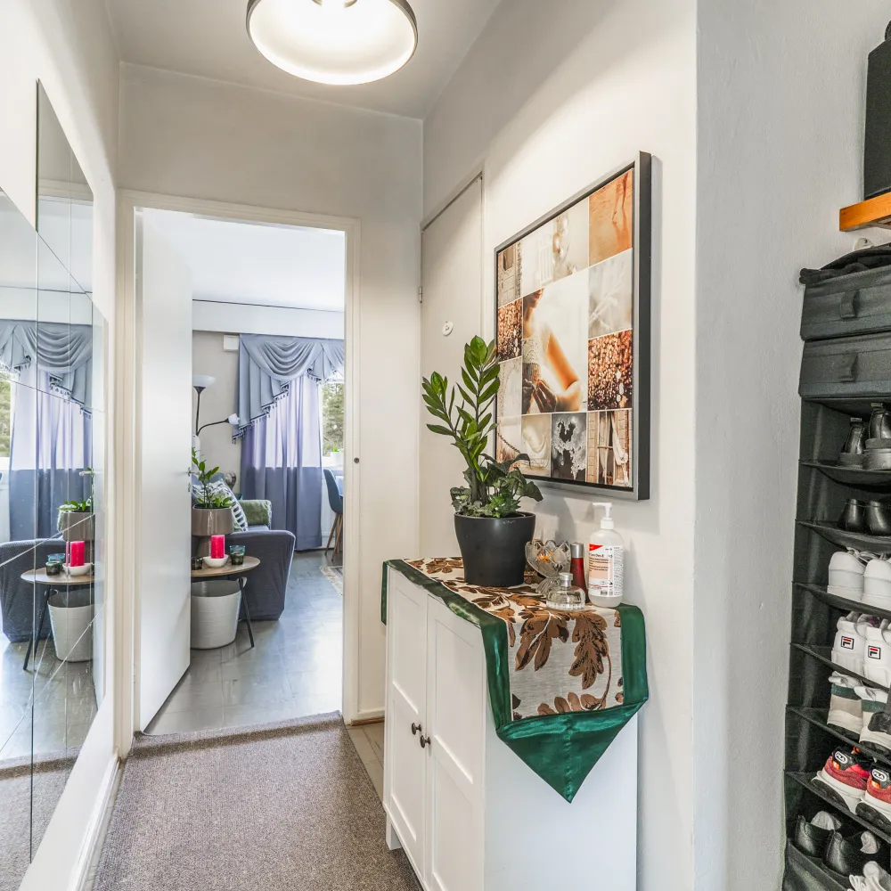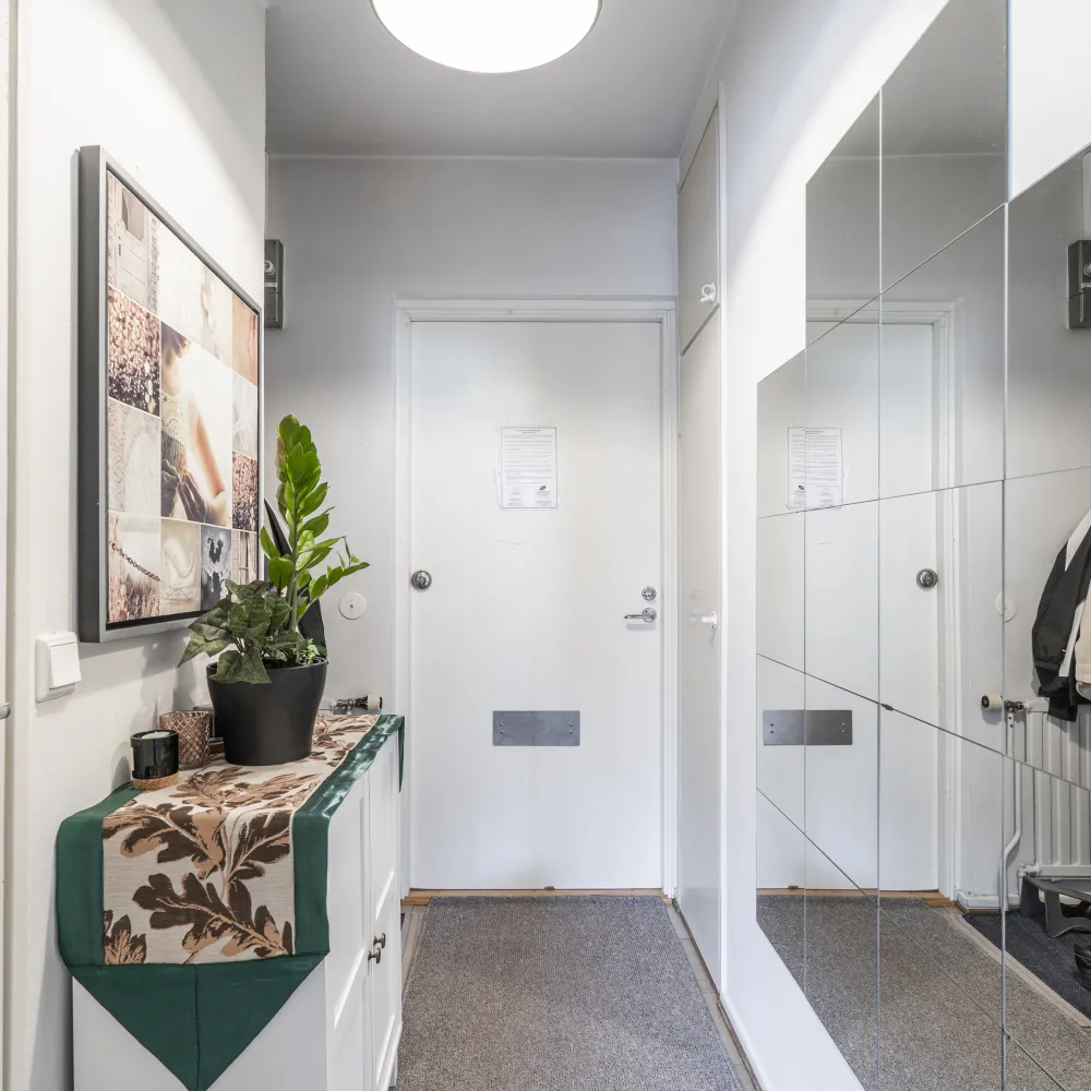 I hallen finns avhängningsmöjligheter i form av en garderobsnisch såväl som en inbyggd garderob.