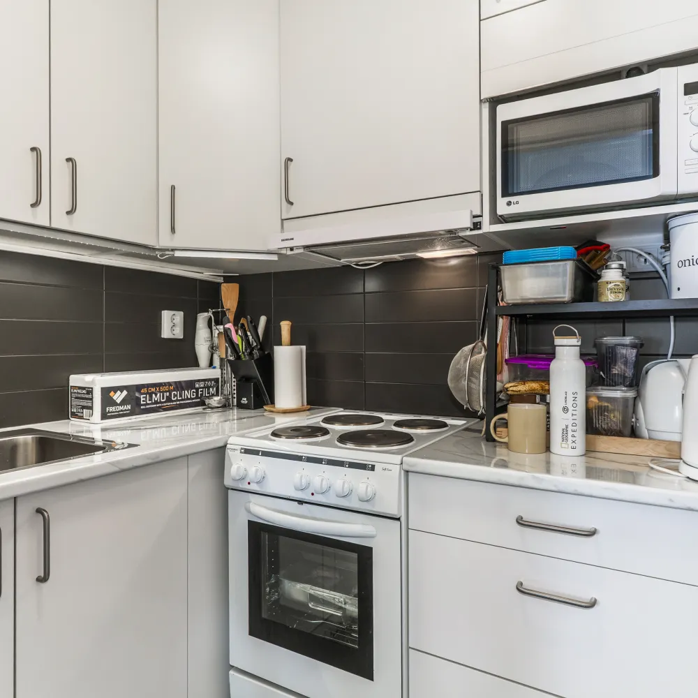 Kokvrån moderniserades år 2016 och inrymmer kombinerad kyl och frys, spis, fläkt, diskbänk med ho samt förvaring.
