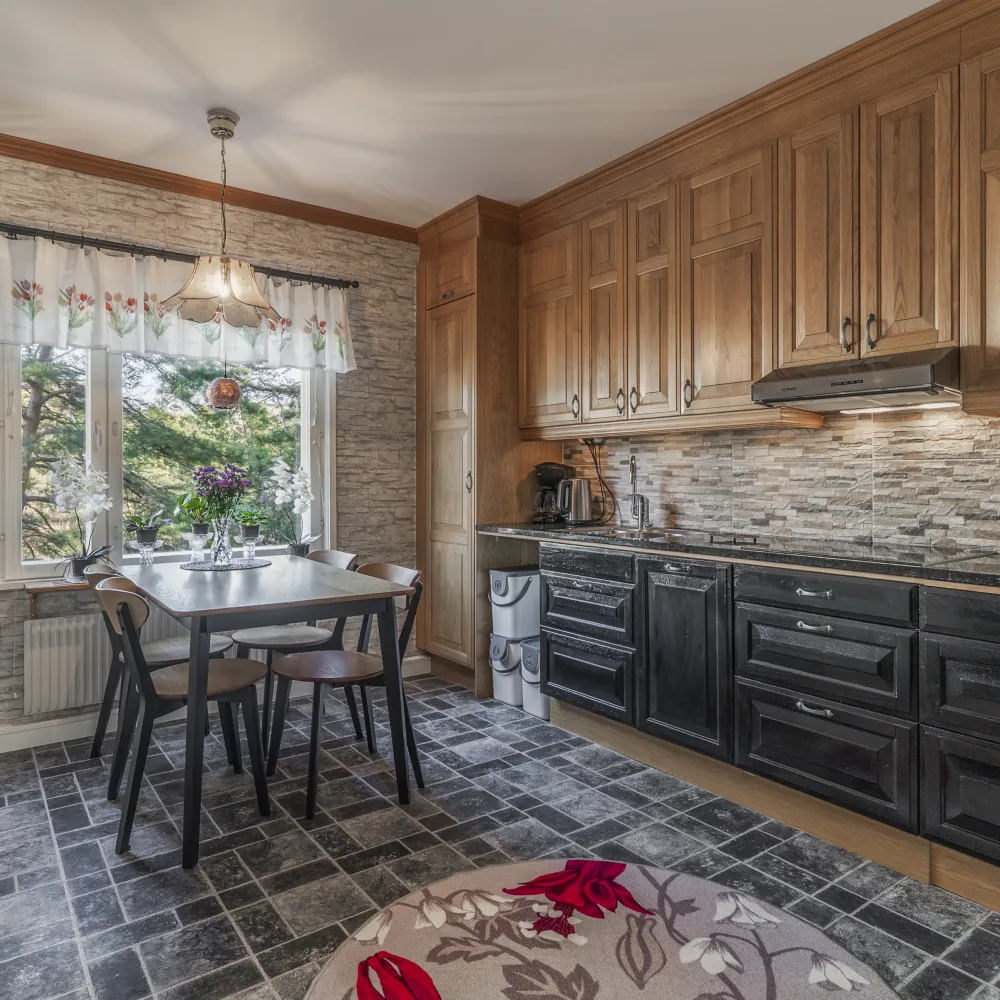 Köket har gedigen skåpinredning i ek samt bänkskiva av granit. Vitvarorna utgörs av kyl/frys, diskmaskin, induktionshäll, fläkt, varmluftsung och mikrovågsugn vilken är integrerade i skåpinredningen. Köket inrymmer gott om plats för matbord.