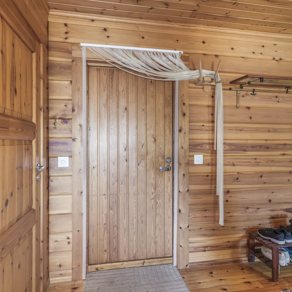 Invändigt inrymmer stugan tambur, storstuga med kök och allrum, ett sovrum och ett tvättrum. De invändiga ytskikten utgörs huvudsakligen av trägolv och stockväggar.
