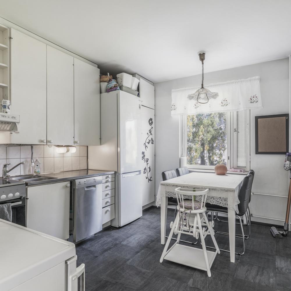 Det ljusa och funktionella köket har full utrustning med nya vitvaror från 2024 – kyl, fläkt, ugn, spis och diskmaskin. Här finns dessutom plats för ett matbord där familj och vänner kan samlas till vardag och fest.
