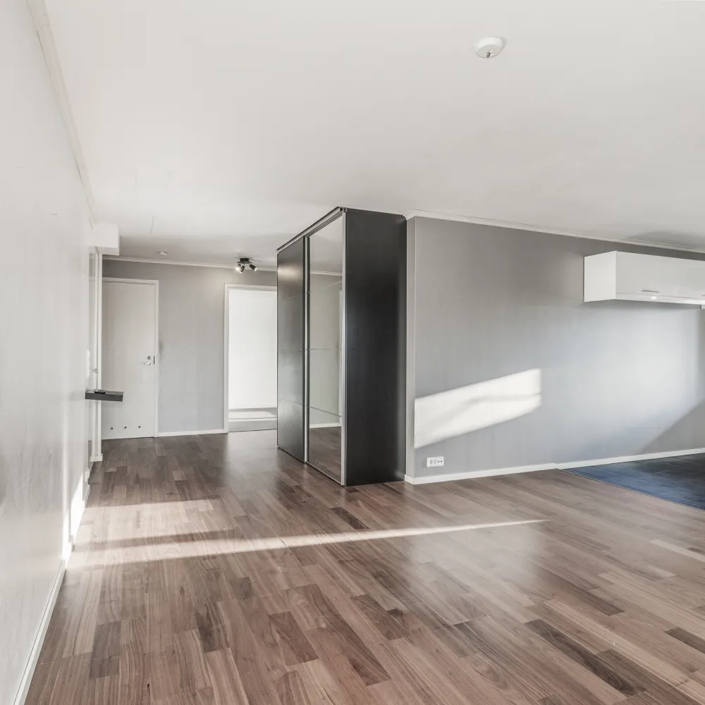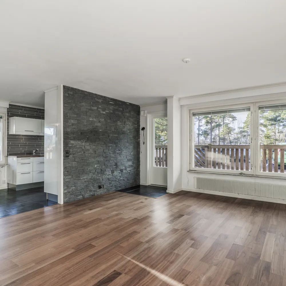 Planlösningen är praktisk och tillika trivsam med trevligt ljusinsläpp genom stora fönster. Från vardagsrummet mot väster finns en rymlig balkong som sträcker sig runt hörnet och formar en L-form.