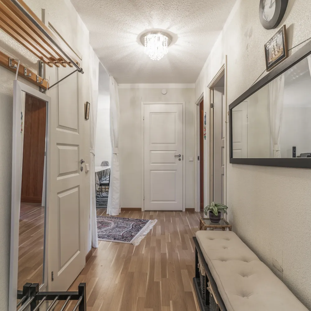 Vardagsrummet är ljust och inrymmer gott om plats för soffa, tv samt matplats. Ifrån vardagsrummet tar du dig enkelt ut till den lilla men trevliga inglasade balkongen i väster läge.