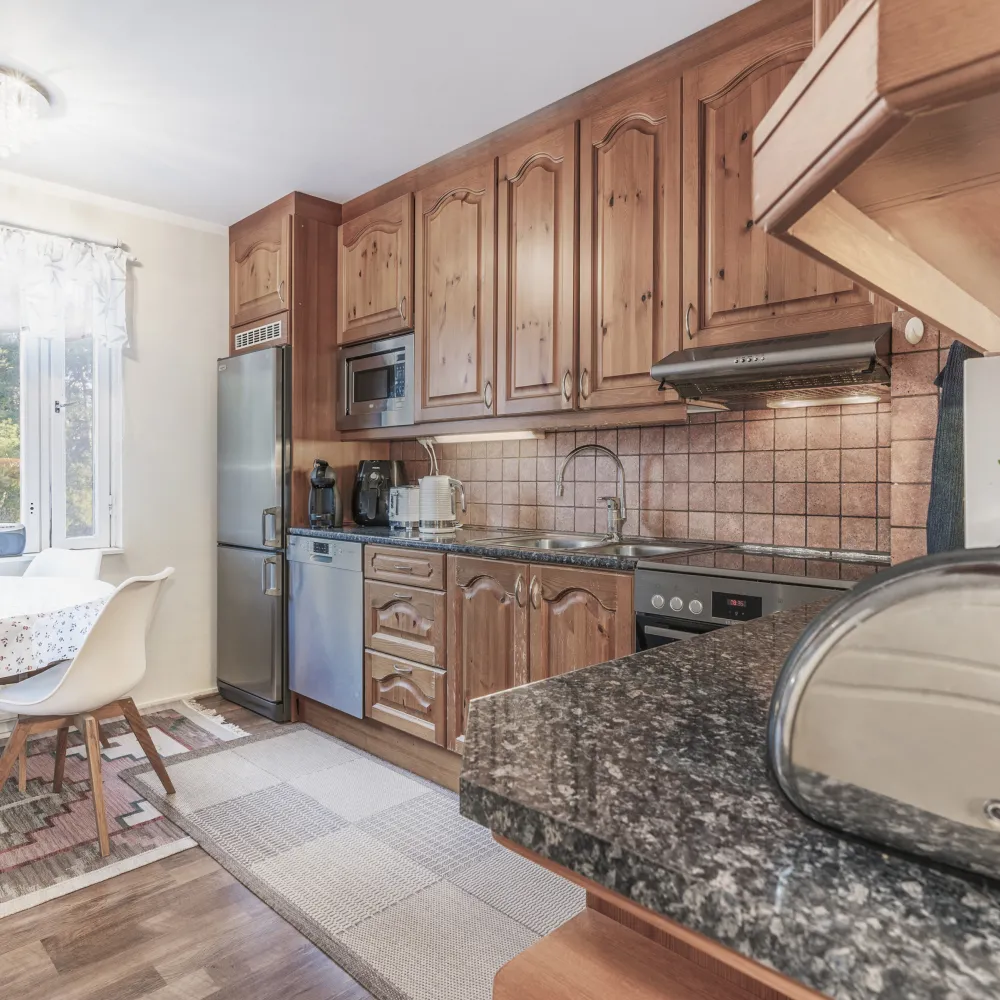 Köket har förvaring i form av skåpinredning samt vitvaror utgörande köksspis, fläkt, bänkdiskmaskin, mikro samt kyl/frys. Köket rymmer även plats för egen matgrupp