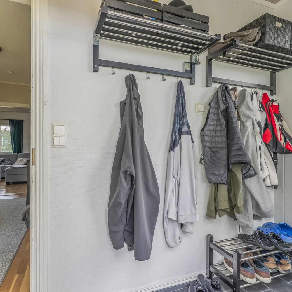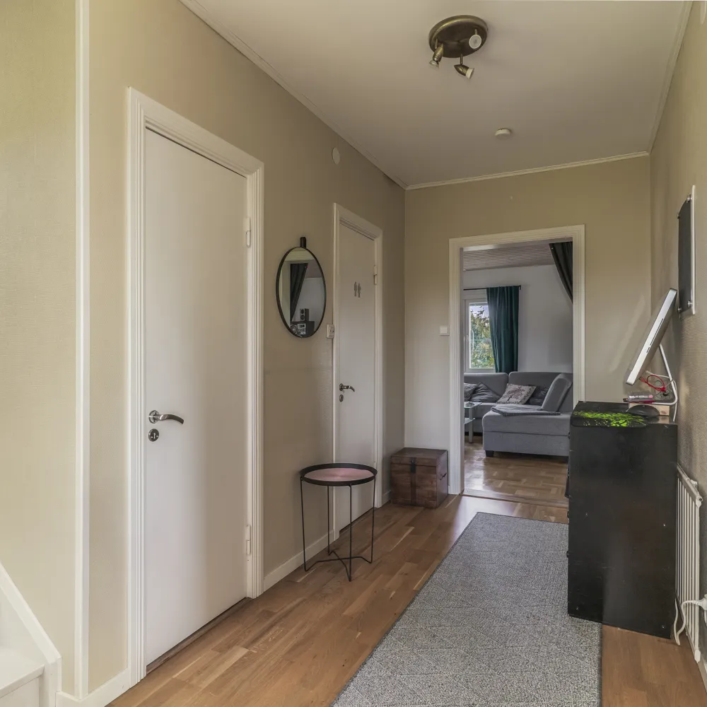 Ovanvåningen inrymmer allrum, tre sovrum samt förvaring i förrådsutrymme/skrubb. Två av sovrummen har förvaring i egen klädkammare och det tredje sovrummet inrymmer förvaring i garderober.