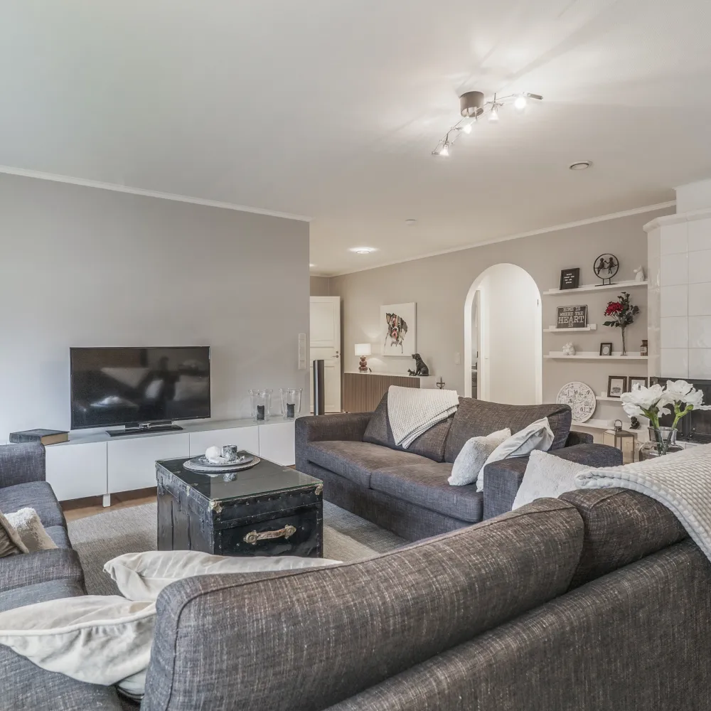 Vardagsrummet är sammantaget rymligt och ljust med trevligt ljusinsläpp genom burspråk. Här finns även vedeldad kakelugn samt gott om utrymme för soffgrupp och tv-möblemang.