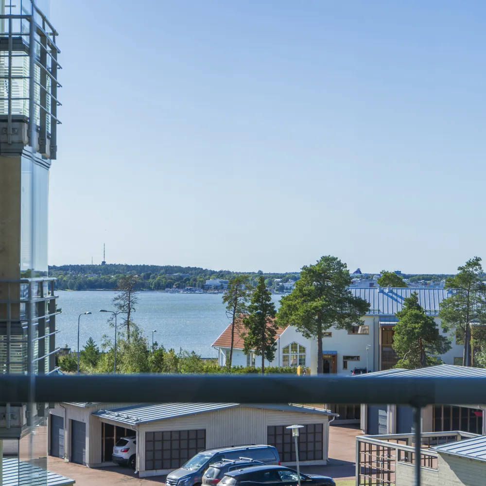 Lägenheten inrymmer två rum och kök. I en halvöppen planlösning till köket ligger vardagsrummet som har trivsamt ljusinsläpp genom fönster mot tre väderstreck och utgång till den rymliga, inglasade balkongen med sjöutsikt.
